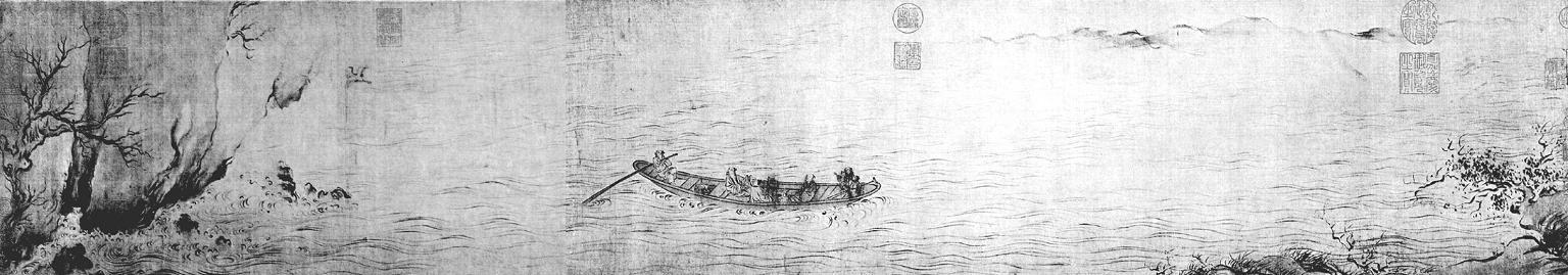 苏轼被贬黄州,两度夜游黄州赤壁,写下了前后《赤壁赋》和著名的《念奴娇·赤壁怀古》,寄怀古幽思,泄胸中块磊。《赤壁赋》主要写真景实情,《后赤壁赋》描写了较多虚景幻境。马和之的《赤壁后游图》,画面景象比较简练,却点出了主要情节。一叶扁舟随波漂荡,艄公挟橹观景,正是“放乎中流,听其所止而休焉”的情景。
