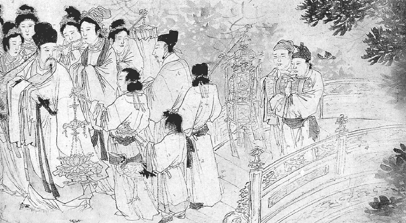 苏东坡被皇上召回后任命于翰林院。一夜,忽被太皇太后召见,向他解释原委,并重申对他的信任,而后太皇太后派人送苏轼回翰林院,并送他金莲灯为他照明。此图表现的正是这一情节。