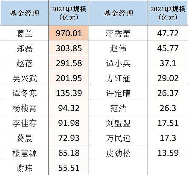 葛兰其实实力是很强的,但现在她明显管理规模过大,影响超额收益。郑磊、赵蓓规模也偏大了,不过他们还有全市场基金。吴兴武规模稍微超过200亿,勉强还能接受。