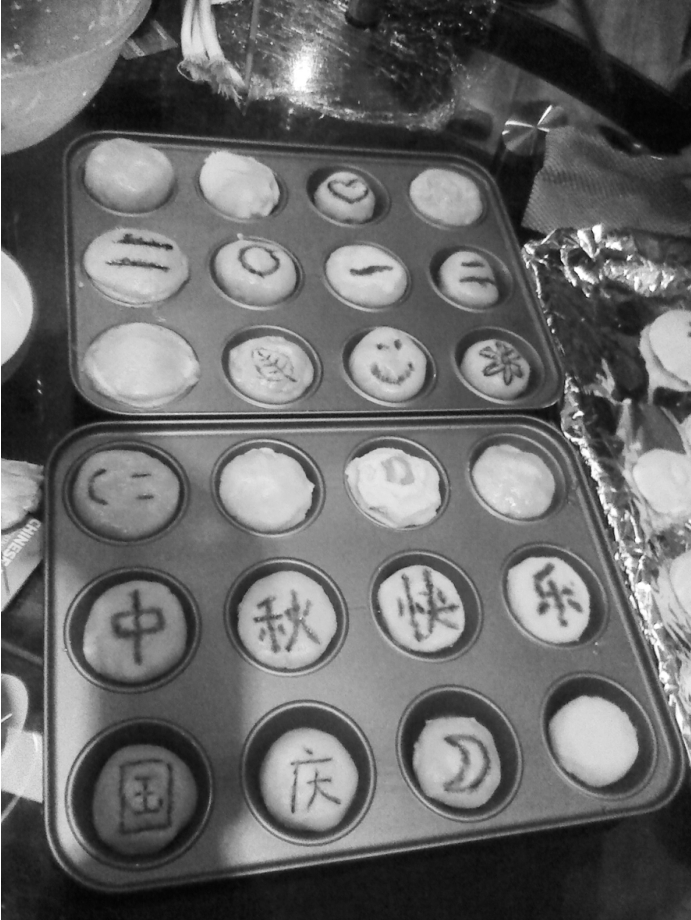 说话间,有人说面已经和好,我一看原来是艾玛丈夫在一丝不苟地按照配料表操作,这个国际政治与关系学院的博士生一到就开工了,他已雷厉风行地把一大盆面和好了。做馅儿时,大家决定用蛋黄、莲蓉和榛子。马克端来咸鸭蛋,煮熟一部分,去白留黄,一切两半像月亮。艾玛丈夫又打了几个生咸蛋,也是去白留黄搅拌后放着,说是要涂在月饼表面,烤好后黄橙橙的好看,说着笑着指着自己说:“嘿嘿,英国吃货,爱吃中国饭菜。”