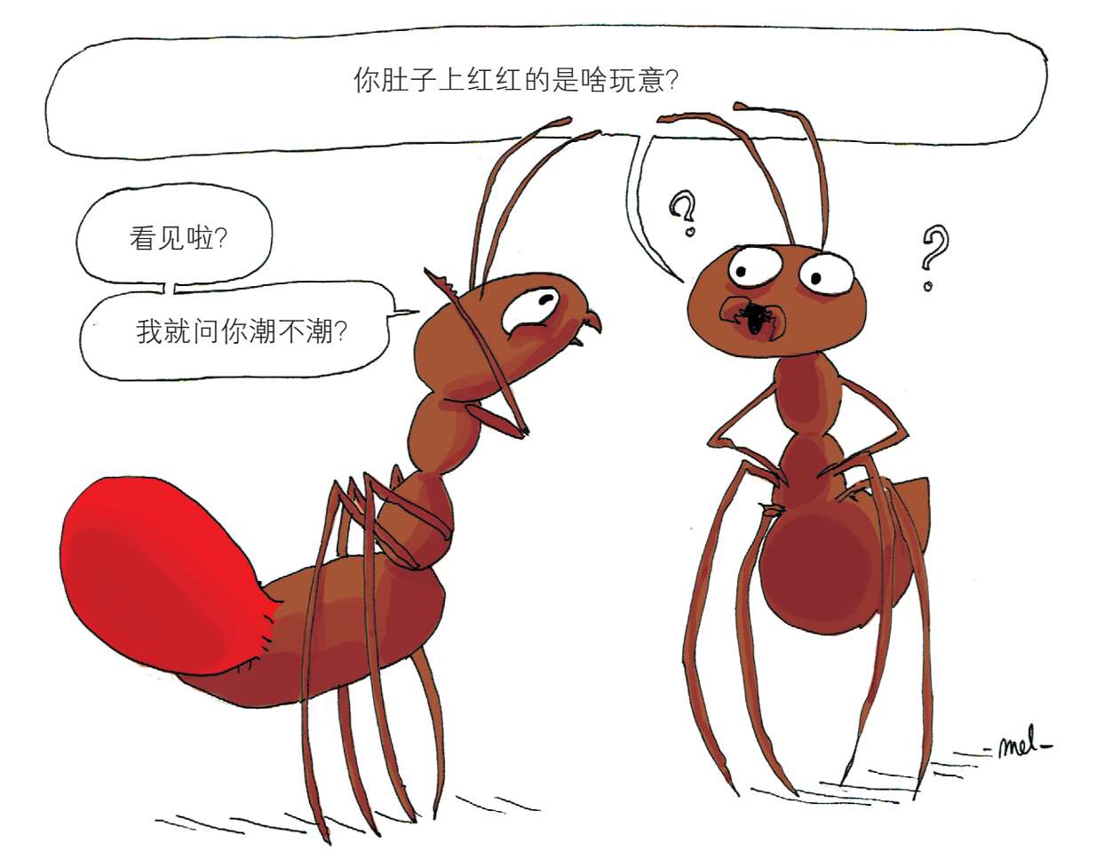 寄生虫的第一个天赋就是丰富食物网。以蚂蚁窝为例,蚂蚁们围绕着自己的窝干着日常工作。工蚁们忙着寻找食物,并未发觉有一种奇怪的现象正在它们之中发生。在这些来来往往的成群的小黑点中,有些蚂蚁外形奇异,显得十分突出。它们的腹部有一个红色小泡,好像浆果一样。这些蚂蚁好像对自己与众不同的外表十分自豪,将红色小泡高高举起,在一群蚂蚁中特别显眼。