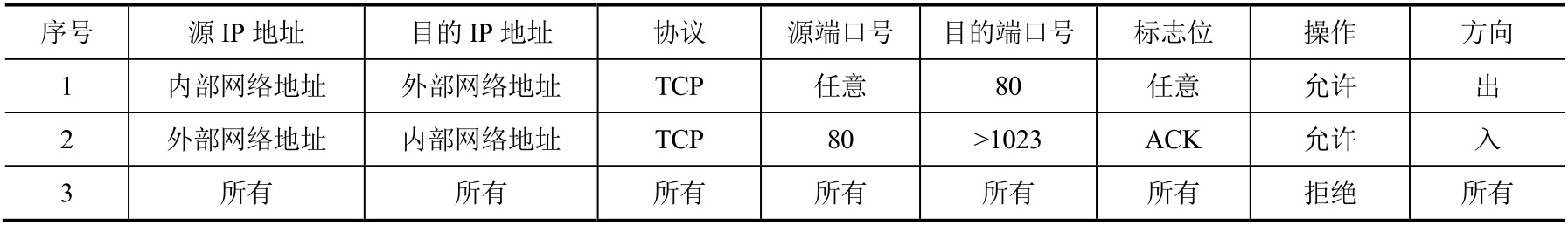 该表中的第1条规则允许内部用户向外部Web服务器发送数据包,并定向到80端口;第2条规则允许外部网络向内部的高端口发送TCP包,只要ACK位置位,且流入包的源端口为80,即允许外部Web服务器的应答返回内部网络;最后一条规则拒绝所有数据包,以确保除了先前规则所允许的数据包外,其他所有数据包都被丢弃。