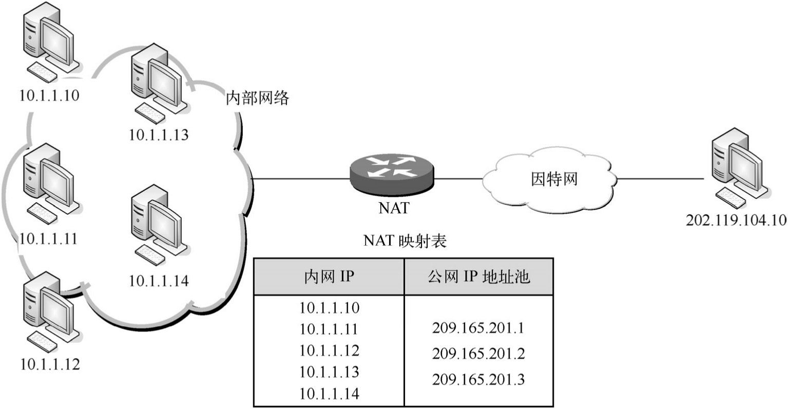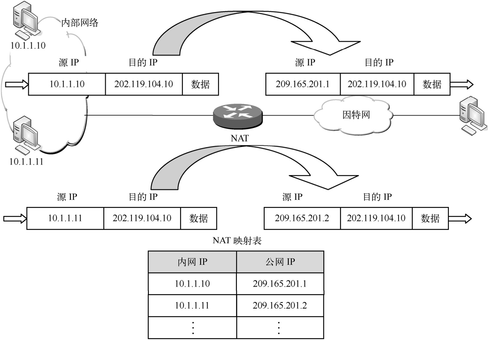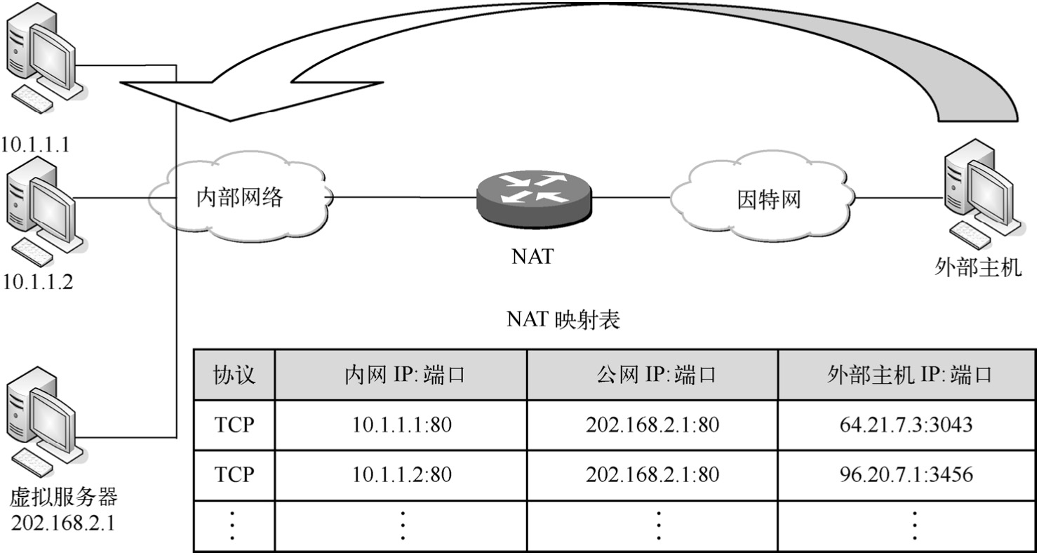 网络地址转换(Network Address Translation,NAT),也称为IP地址伪装(IP Masquerading)。NAT技术并非为防火墙而设计,最初目的是允许将私有IP地址映射到公网(合法的因特网IP地址),以缓解IP地址短缺的问题。然而在实际应用中,NAT技术已经成为防火墙采用的核心技术之一,因为其具有以下一些功能。