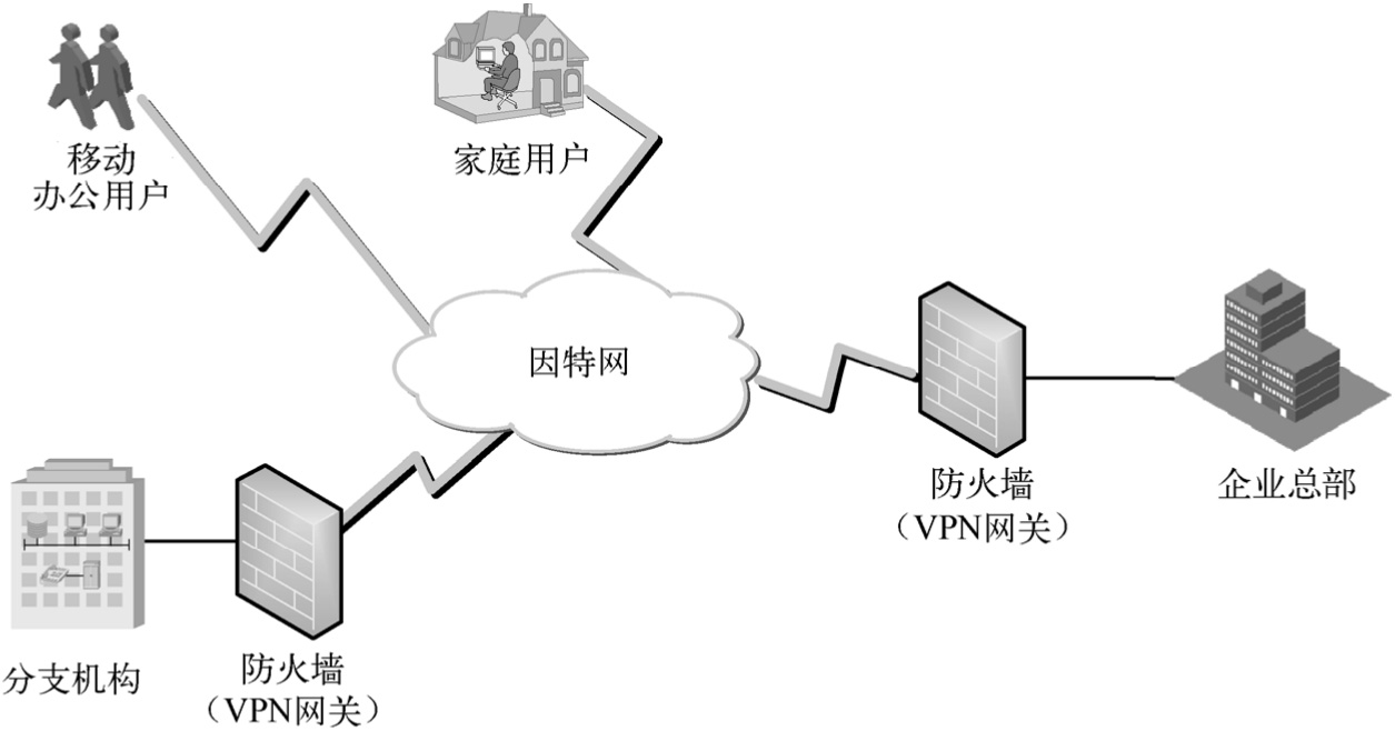如图2-5所示,在实际应用中,远程用户(移动办公用户、家庭用户)有着安全访问内网的需求。虚拟专用网(Virtual Private Network,VPN)是实现这一安全通信需求的重要技术。