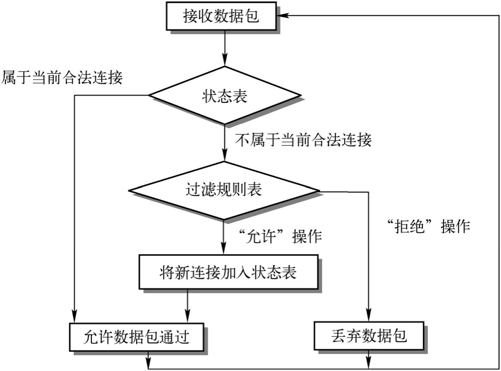 步骤1:当接收到数据包时,首先查看状态表,判断该包是否属于当前合法连接,若是,则接受该包让其通过,否则进入步骤2。