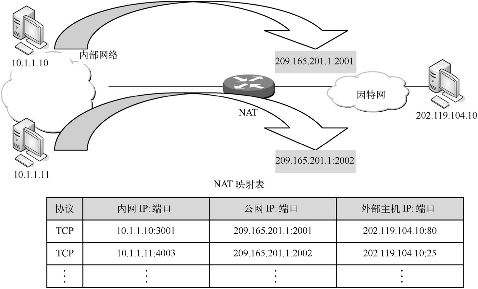 PAT作为动态NAT的一种形式,它将多个内部IP地址映射成为一个公网IP地址。从本质上讲,网络地址映射并不是简单的IP地址之间的映射,而是网络套接字映射,网络套接字由IP地址和端口号共同组成。当多个不同的内部地址映射到同一个公网地址时,可以使用不同端口号来区分它们,这种技术称为复用。