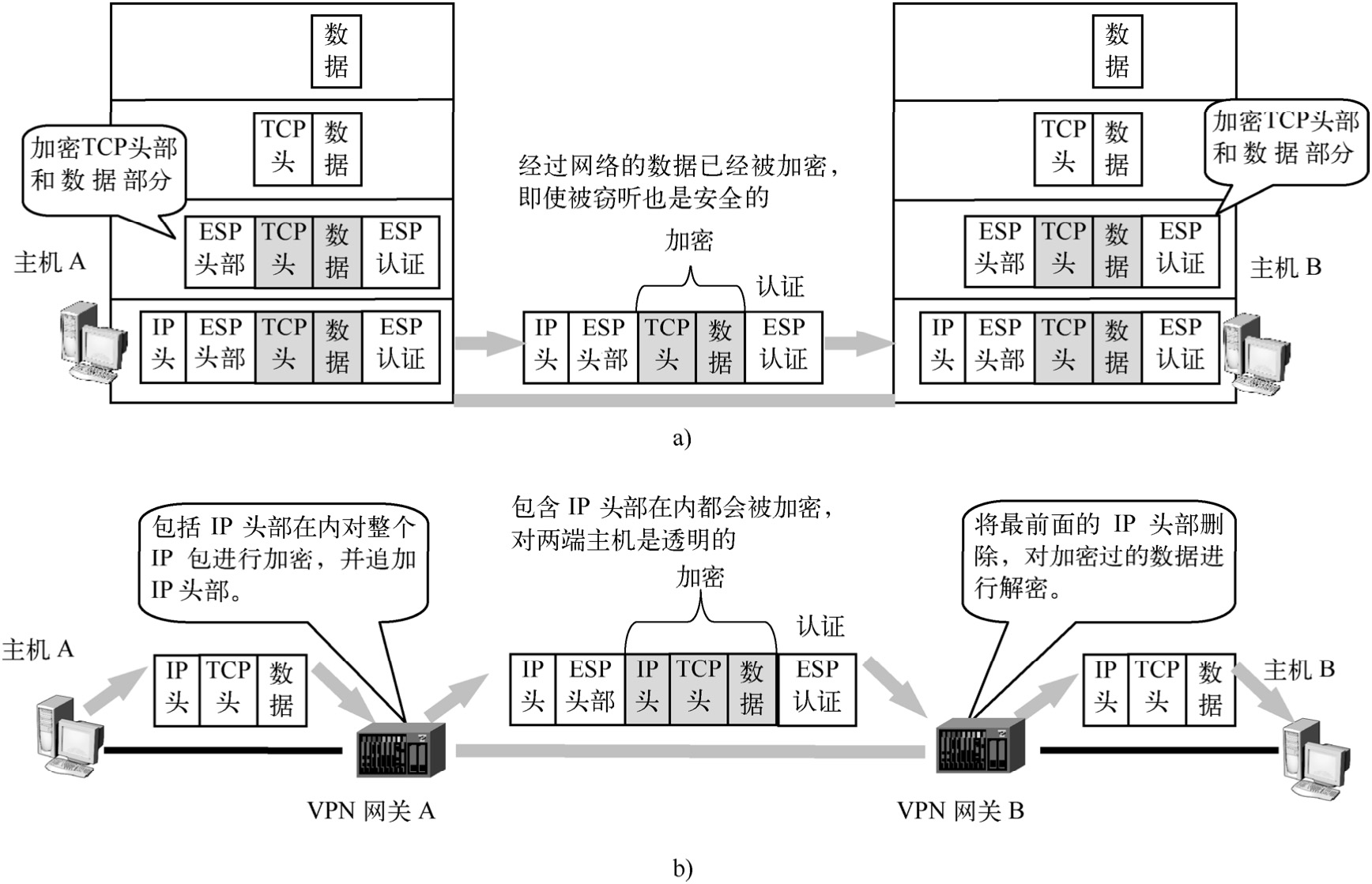 1)传输模式是用于在两台主机之间进行的端到端通信。发送端IPSec将IP包载荷用ESP或AH进行加密或认证,但不包括IP头,数据包传输到目的IP后,由接收端IPSec认证和解密。