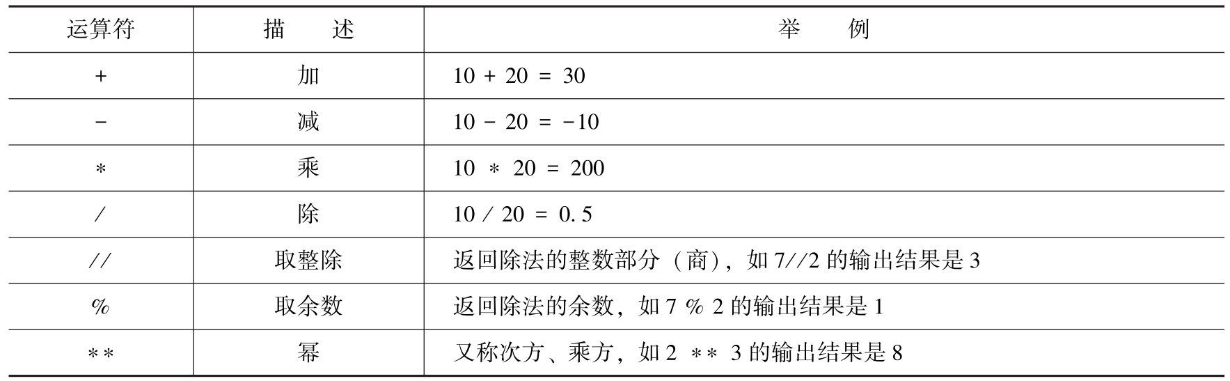 算术运算符是运算符的一种,用于完成基本的算术运算。算术运算符常用来处理四则运算,具体描述如表2-2所示。