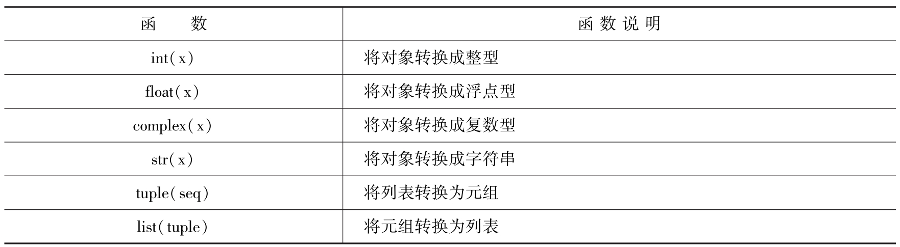 在处理数据时经常需要转换数据的格式,以方便数据遍历等操作,这时候需要借助一些函数实现数据类型的转换。常见的数据类型转换函数如表2-1所示。