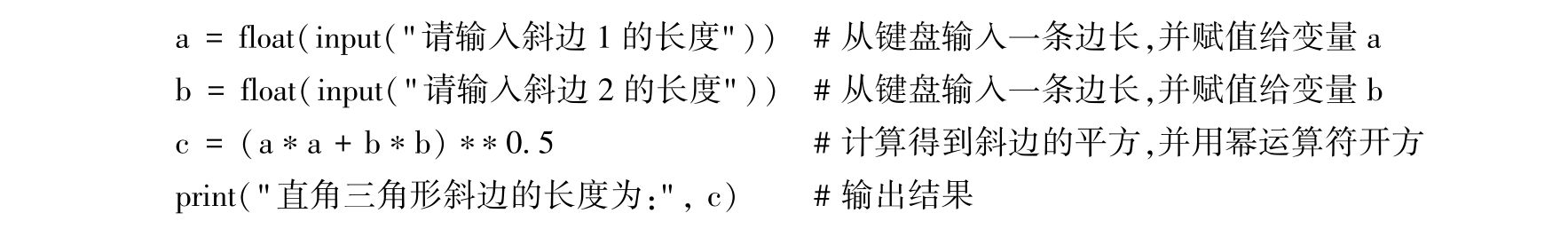 【例2-1】 输入直角三角形两个直角边的长度a、b,求斜边c的长度。