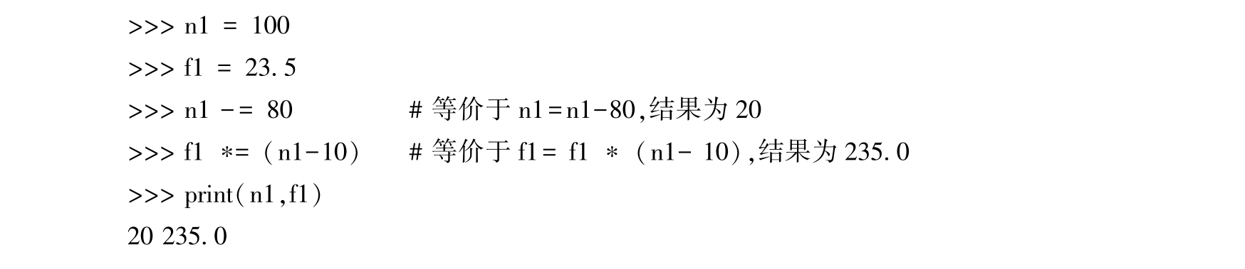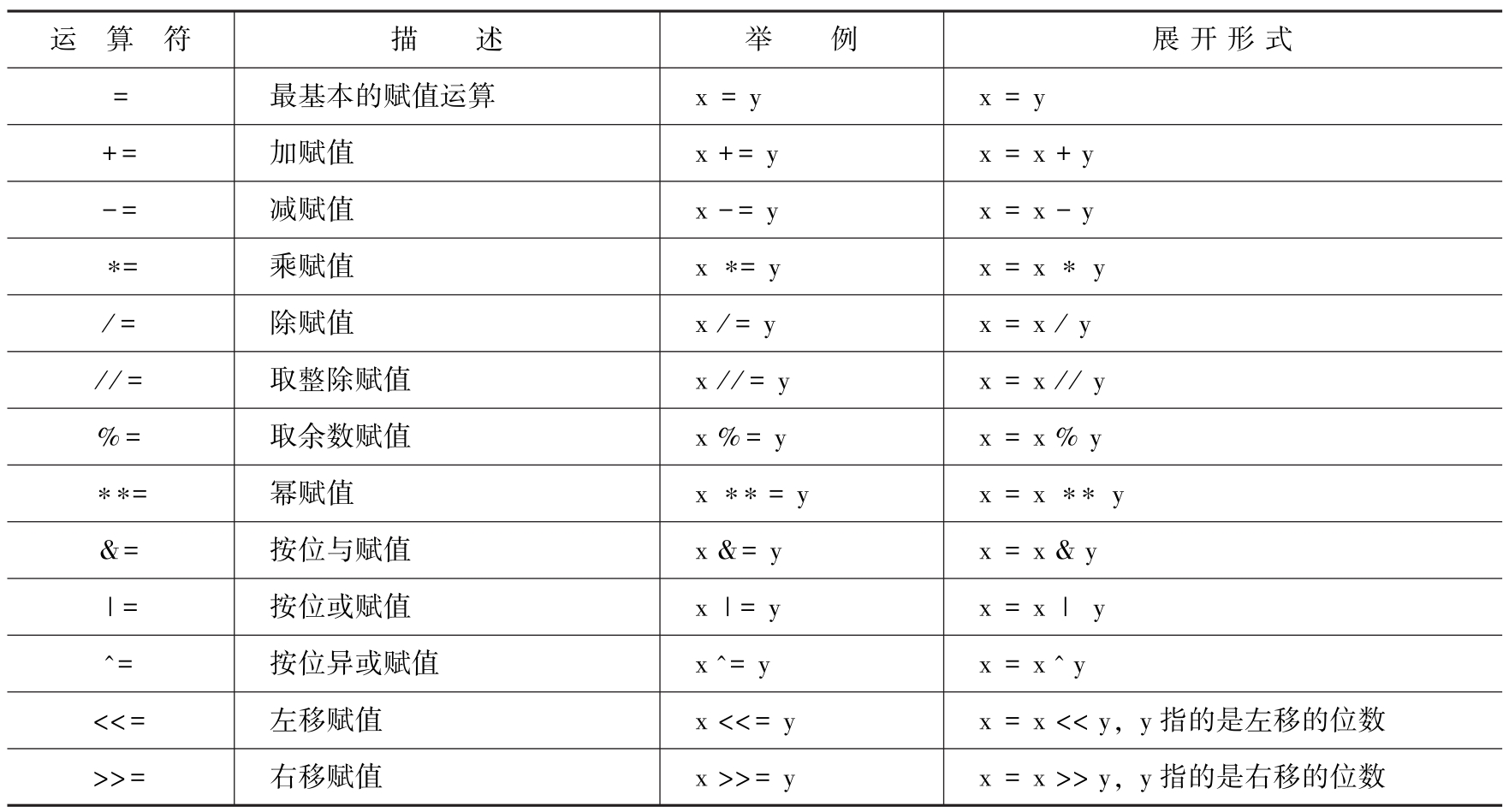 赋值运算符“=”还可与其他运算符(算术运算符、位运算符等)结合,成为功能更强大的复合赋值运算符,具体如表2-3所示。