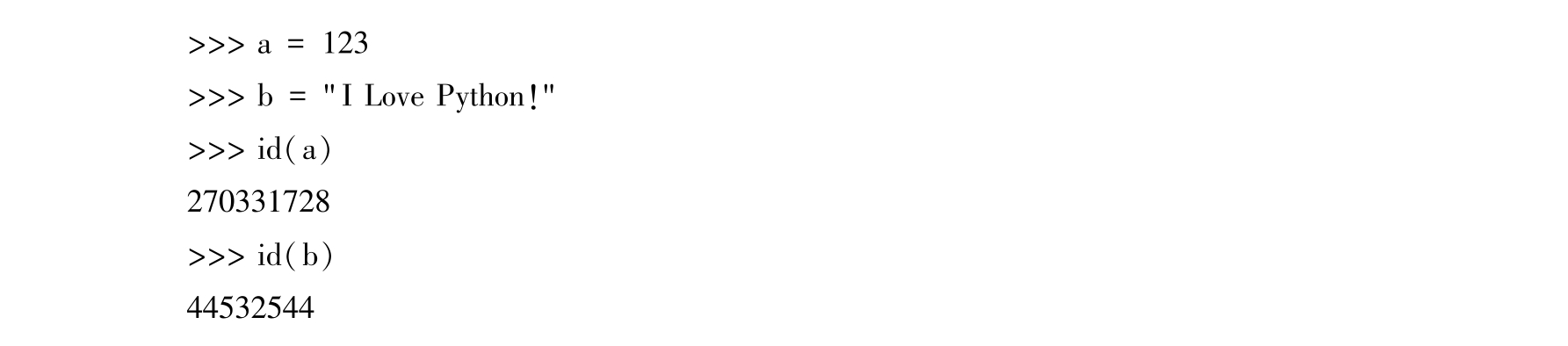 例如,查看数字123和字符串"I Love Python!"在内存中的地址。