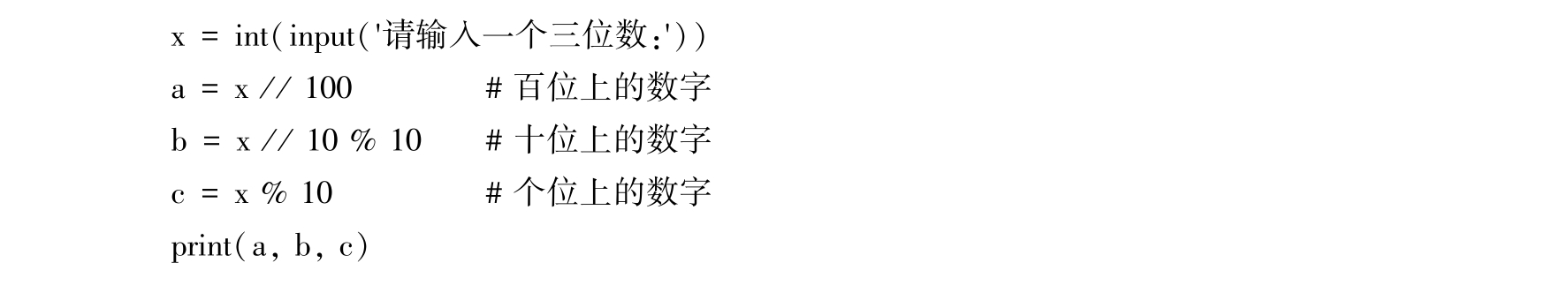 基本思路:通过input()函数让用户从控制台输入一个三位数,并将输入的内容强制转化成整型数值,然后计算出百位、十位、个位上的数字。算术运算符//和%分别表示整除和取余。百位上的数等于该数整除100取商,十位上的数等于该数整除10后的商再对10取余,个位上的数等于该数对10取余,最后将结果输出显示。