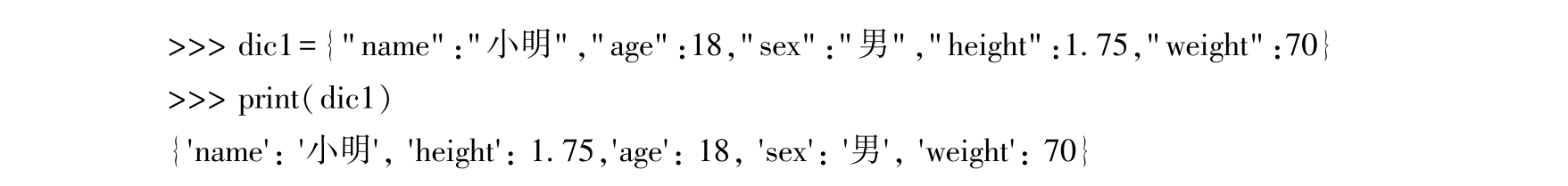 字典是Python中除列表以外最灵活的数据类型。它用于存放具有映射关系的数据,字典可以使用一对花括号{ }定义。字典使用键值对存储数据,键值对之间使用逗号分隔,键(Key)是索引,值(Value)是数据,键和值之间使用冒号:分隔。字典是一个无序的数据集合,当使用print()函数输出字典时,有时输出的顺序和定义的顺序是不一致的。例如: