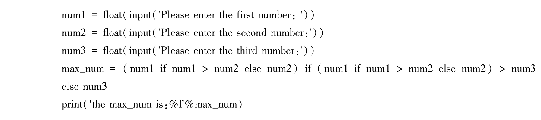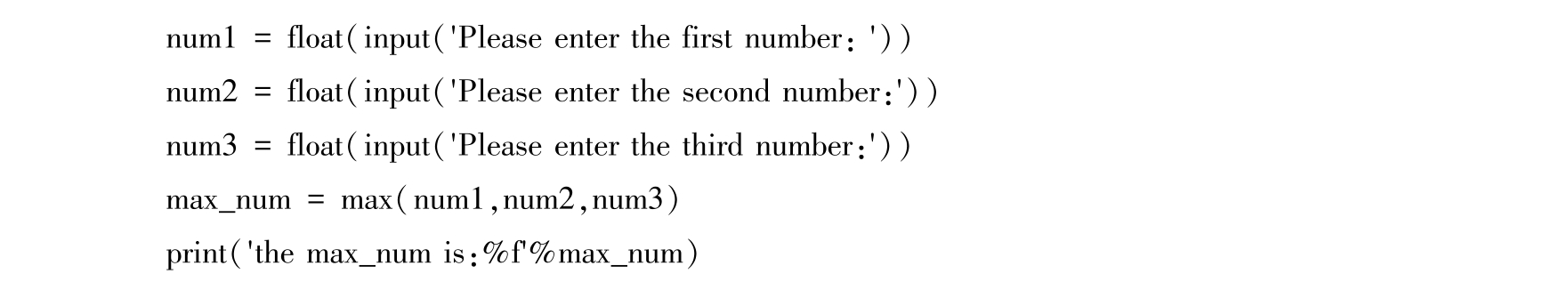 方法一基本思路:通过input()函数让用户输入三个数字,并将其转化成float型数值,接着通过穷举各种大小关系找到最大值。此案例判断条件为多个,可以使用if…elif…else…多分支结构来进行编程。首先用num1与num2、num3比较,若num1既大于num2又大于num3,则num1为最大值;若num2既大于num1又大于num3,则num2为最大值;若都不成立,则num3为最大值,最后将结果输出。