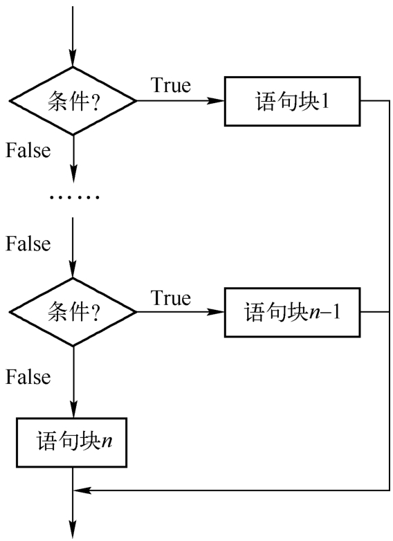 多分支结构是解决复杂问题的重要手段之一,和C、C++、Java语言不同,在Python中是没有switch…case…多分支结构的,可以使用if…elif…else…来代替switch…case…结构。多分支结构的流程图如图3-3所示。