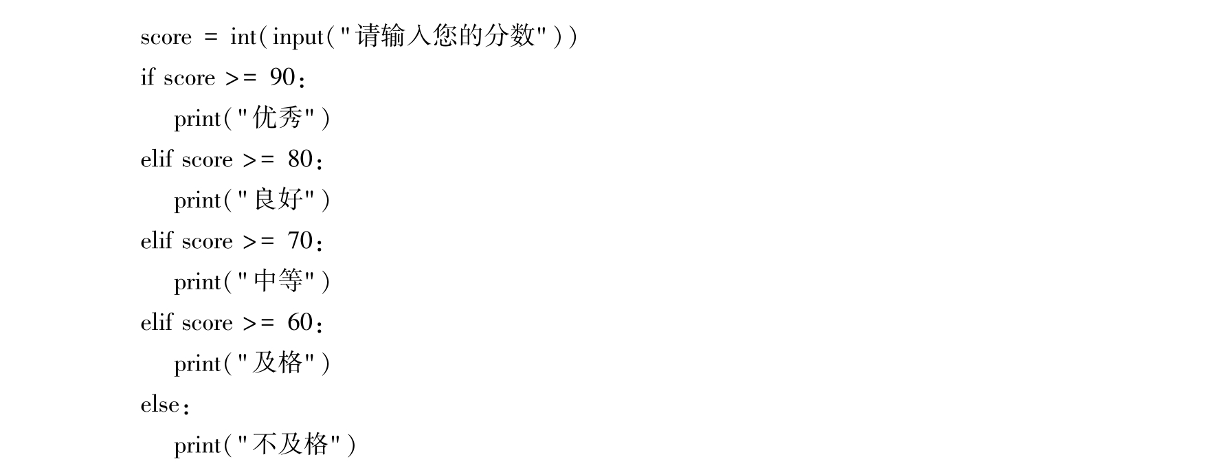 【例3-4】 利用多分支结构判断成绩的等级:当成绩大于等于90分时,等级为优秀;当成绩大于等于80分小于90分时,等级为良好;当成绩大于等于70分小于80分时,等级为中等;当成绩大于等于60分小于70分时,等级为及格;当成绩低于60分时,等级为不及格。