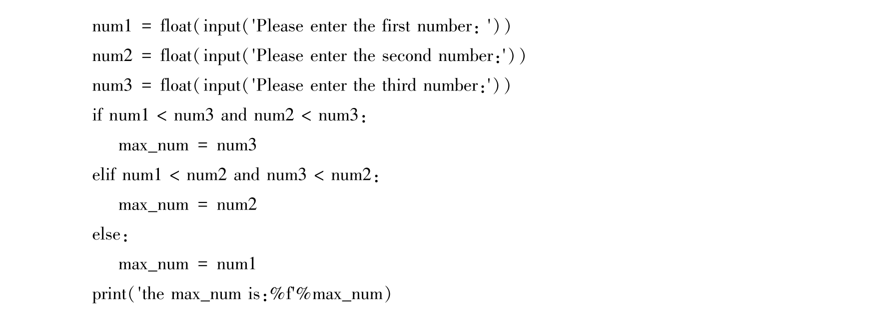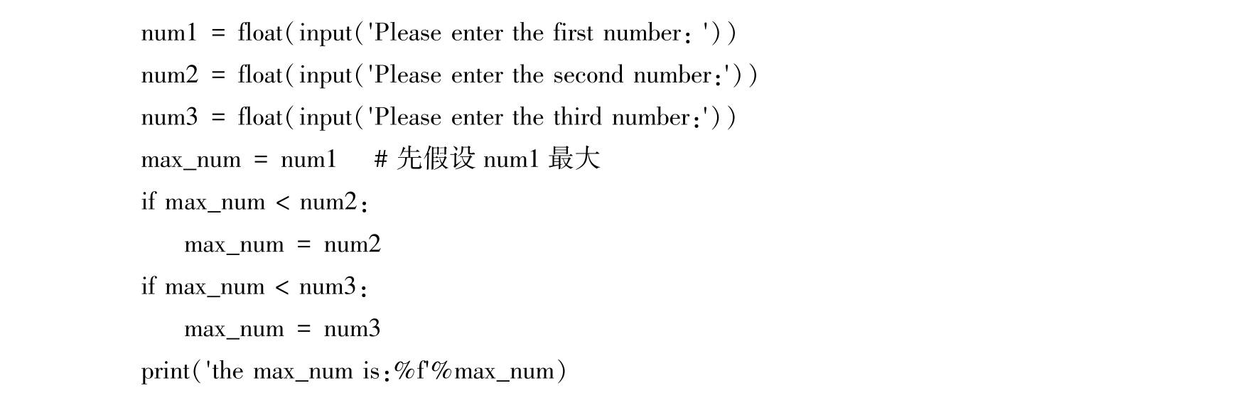 方法三基本思路:首先假定三个数字中num1最大,将其赋值给max_num,然后将max_num逐一与剩下的两个数字进行比较,如果假定的最大值max_num比num2小,则将num2重新赋值给max_num,此时找出的是num1和num2中的较大值,将其与num3进行比较,若num3较大,则将num3赋值给max_num,最后将结果输出。