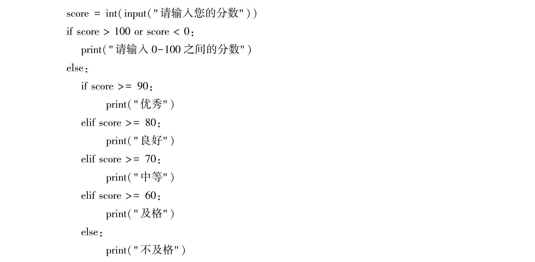 【例3-5】 利用多分支结构判断成绩的等级:当成绩大于等于90分时,等级为优秀;当成绩大于等于80分小于90分时,等级为良好;当成绩大于等于70分小于80分时,等级为中等;当成绩大于等于60分小于70分时,等级为及格;当成绩低于60分时,等级为不及格。要求用户输入的成绩介于0~100之间,当用户输入了不合法的数值时,提示输出“请输入0-100之间的分数”。