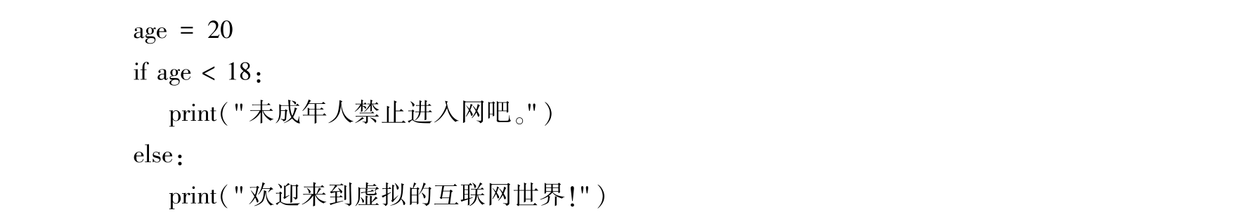 年龄为20时,通过运算if后的判断条件,程序会执行else后的语句块,输出“欢迎来到虚拟的互联网世界!”。