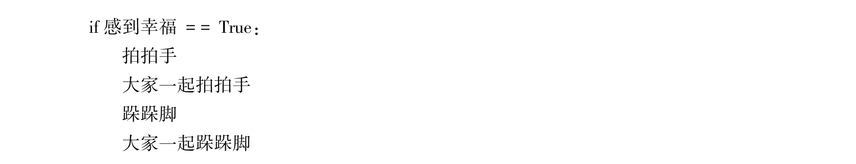 随着歌曲欢快的节奏大家可以动起来,如果感到幸福,就可以做如下动作:拍拍手和跺跺脚。那么怎么将这首欢快的歌曲转换成Python语言呢?在Python语言中满足一定的条件后执行的动作可以用单分支结构来表示。