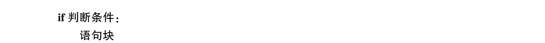 注意 :判断条件就是计算结果必须为布尔值的表达式,其可以用包含>(大于)、<(小于)、==(等于)、>=(大于等于)、<=(小于等于)等运算符的表达式来表示,若判断条件的结果为True,则执行if后面缩进的语句块。同时要注意,判断条件中不能含有赋值操作符“=”,且后面的冒号一定不能少,否则会出现语法错误。