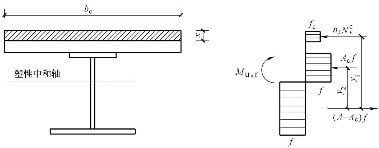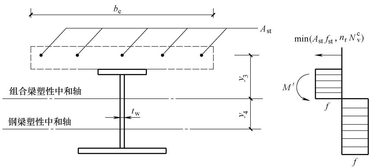 y 4 ——组合梁塑性中和轴至钢梁塑性中和轴的距离,当组合梁塑性中和轴在钢梁腹板内时, y 4 = A st f st /(2 t w f );当该中和轴在钢梁翼缘内时,可取 y 4 等于钢梁塑性中和轴至腹板上边缘的距离。