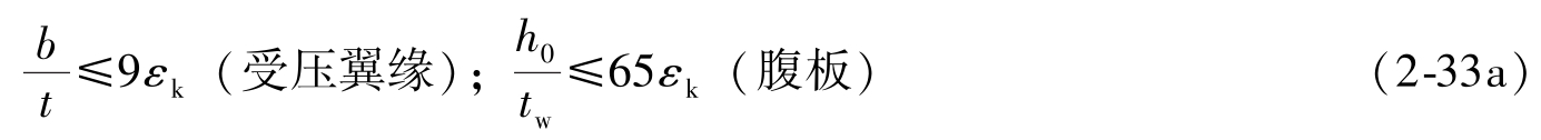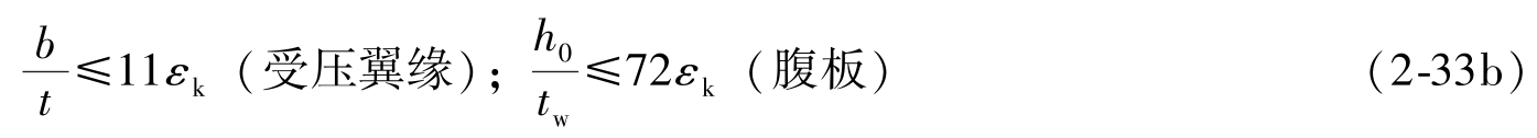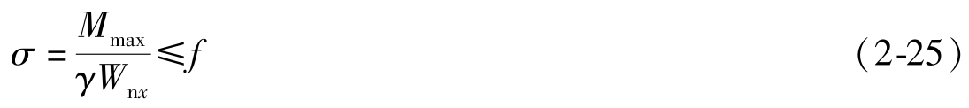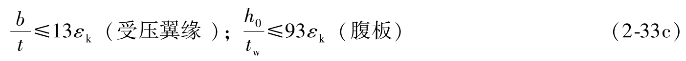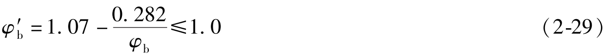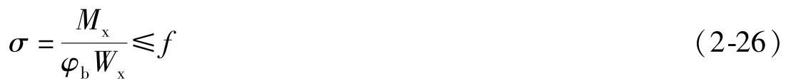 (2)整体稳定性验算 当铺板(各种钢筋混凝土板和钢板)密铺在梁的受压翼缘上与其牢固相连,能阻止梁受压翼缘的侧向位移时,可不计算梁的整体稳定性。其他情况,应按下式验算最大刚度主平面内受弯构件的整体稳定性: