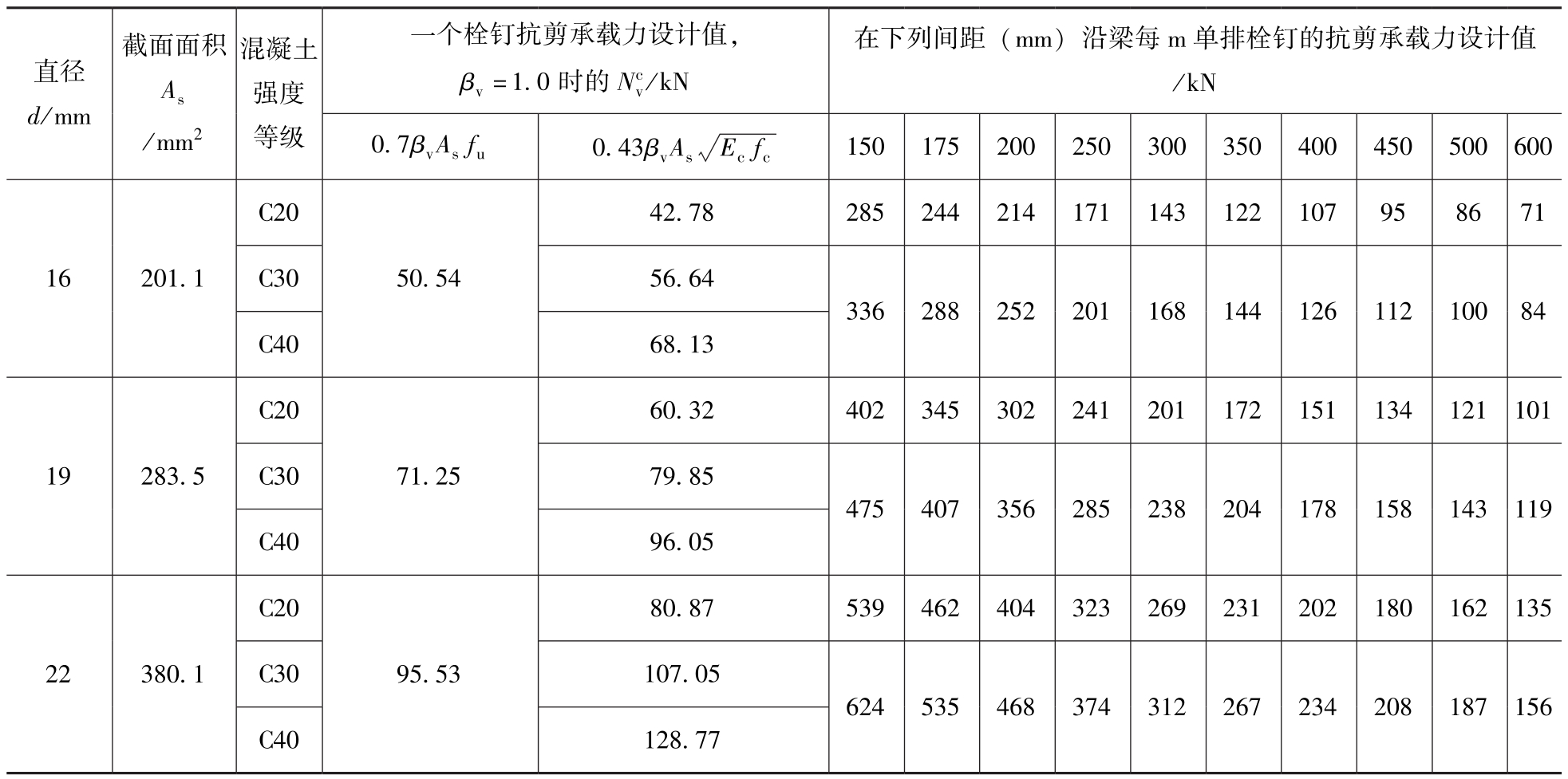 表2-4 β v =1.0时栓钉的抗剪承载力设计值