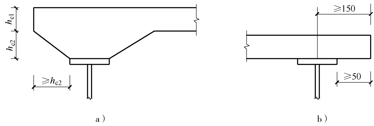 2)组合梁边梁混凝土翼板的构造应满足如图2-16所示的要求。有托板时,伸出长度不宜小于 h c2 ;无托板时,应同时满足伸出钢梁中心线不小于150mm且伸出钢梁翼缘边不小于50mm的要求。