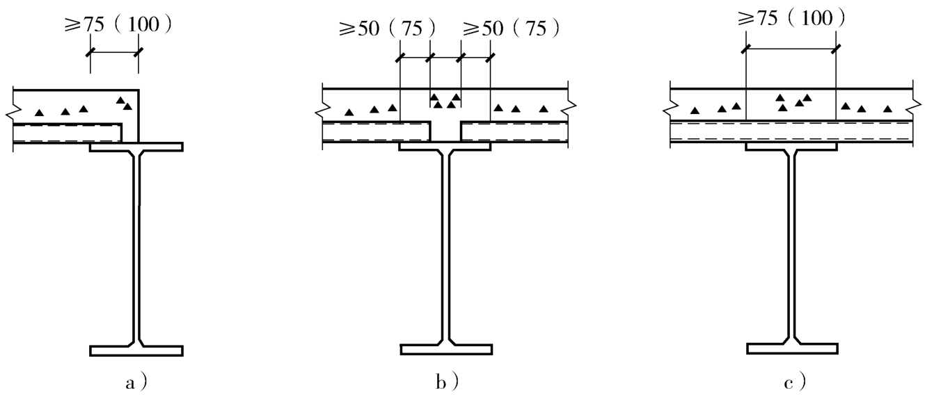 2)组合楼板在钢梁上的支承长度不应小于75mm,在混凝土梁上的支承长度不应小于100mm(图2-15)(图2-15中括号内数字适合于组合楼板支承在混凝土梁上)。当钢梁按组合梁设计时,组合楼板在钢梁上的最小支承长度应符合《钢结构设计标准》(GB 50017—2017)的构造规定。