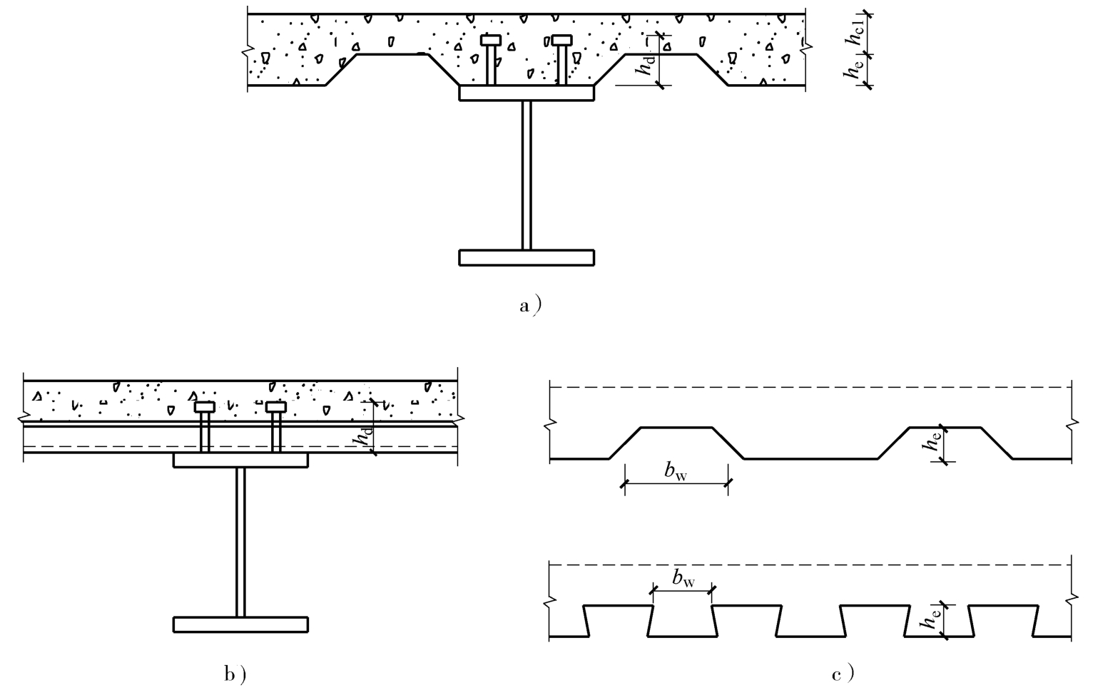a)肋与钢梁平行的组合梁截面 b)肋与钢梁垂直的组合梁截面 c)压型钢板组合板的剖面
