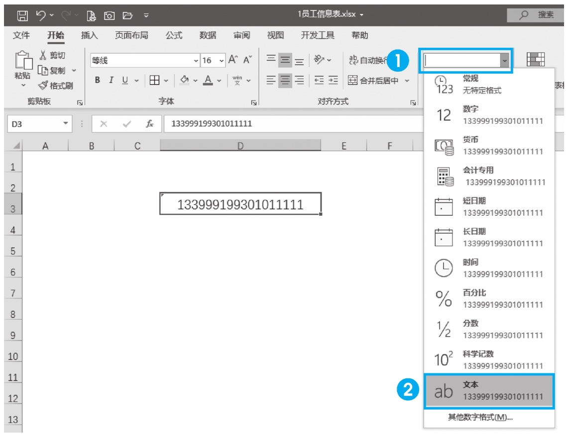 选中需要输入身份证号的数据区域,在【开始】选项卡【数字】功能区下拉列表中选择【文本】,这样将单元格格式设置为文本格式,然后直接输入身份证号即可,见图1-27。