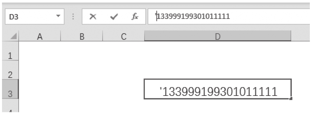 先输入一个英文的单引号“’”,再输入身份证号,这样也会显示正确的身份证号,见图1-28。