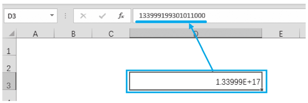 Excel的单元格中,最多只能输入15位数字,如果超过15位,就会用科学计数法表示,超过15位的数字自动变成0,在编辑栏中可以看到效果,见图1-26。