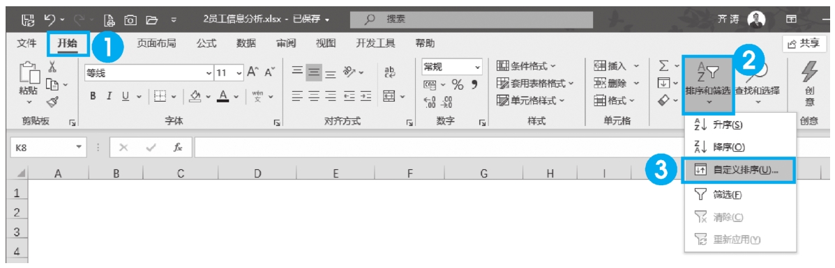 STEP 1: 在【开始】选项卡【编辑】功能区【排序和筛选】下拉列表中选择【自定义排序】,见图2-15。
