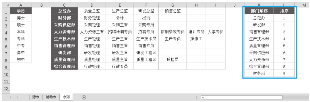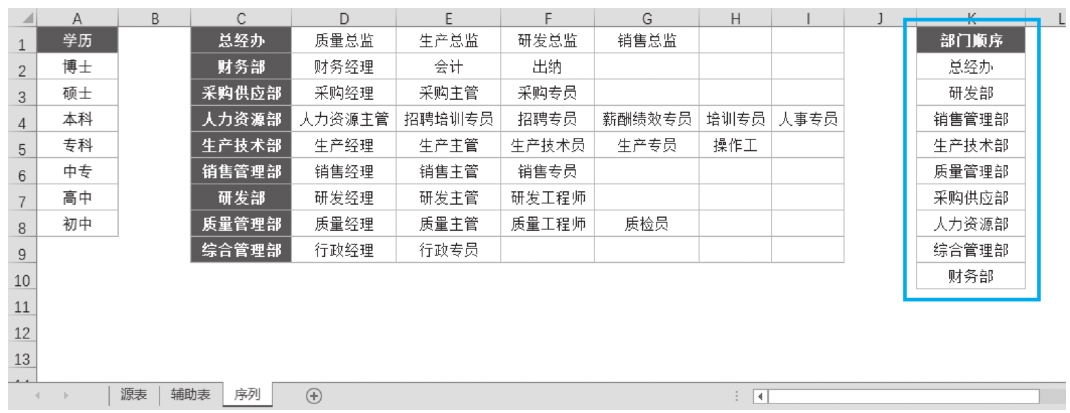 STEP 1: 在“序列”工作表中增加部门内容,并按指定顺序排序,见图2-13。