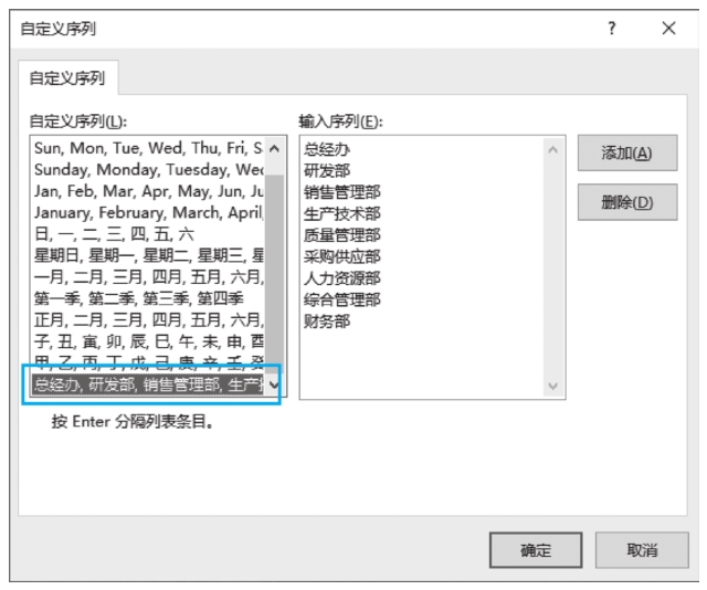 STEP 3: 在弹出的【自定义序列】对话框中选择设置的部门序列,见图2-17,单击【确定】按钮即可完成按指定部门顺序排序。