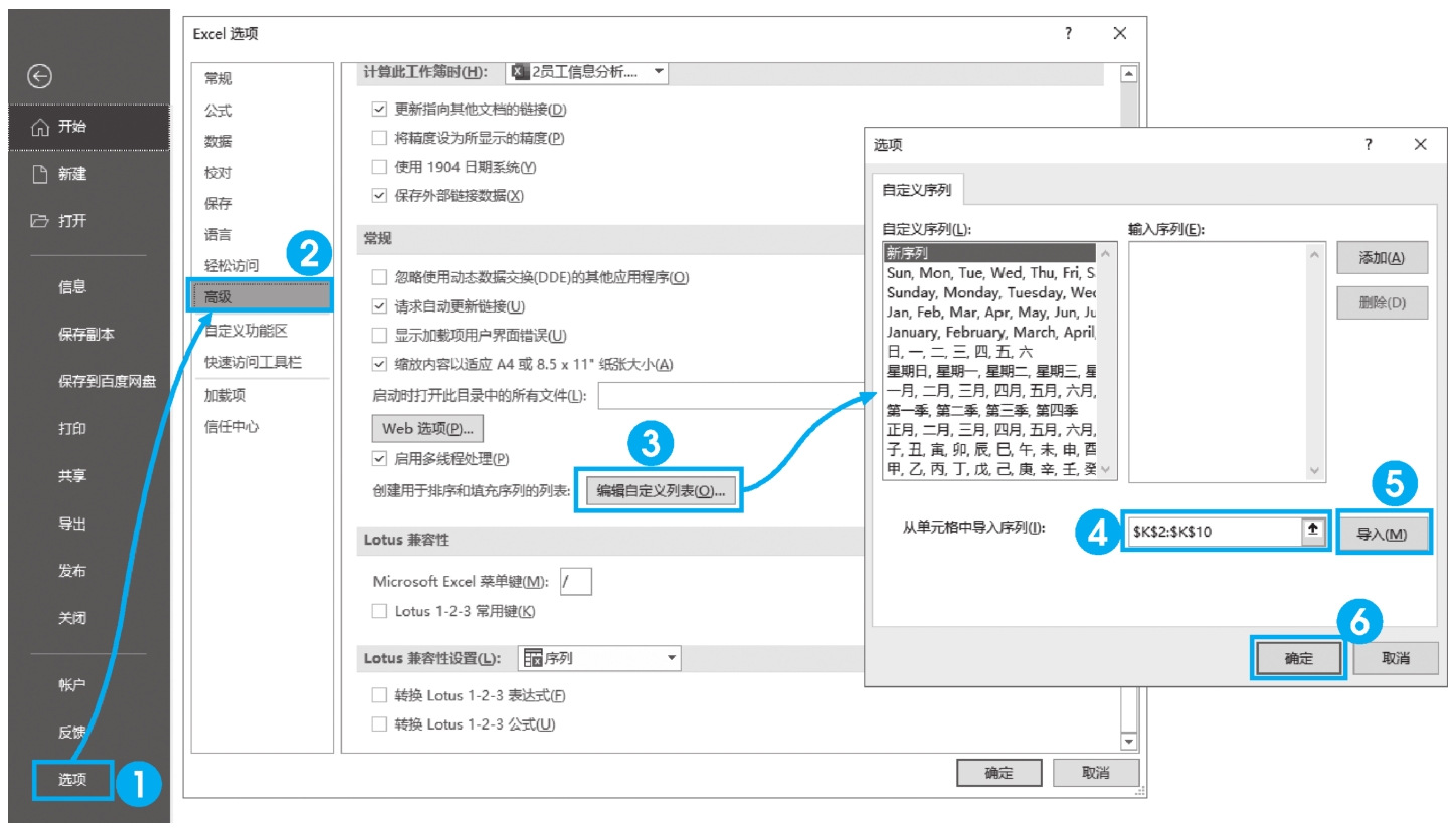 STEP 2: 单击【文件】选项卡,在弹出的【Excel选项】对话框中单击【选项】-【高级】-【编辑自定义列表】,在弹出的【选项】对话框的【从单元格中导入序列】文本框中选择K2:K10数据区域范围,依次单击【导入】-【确定】按钮,见图2-14。