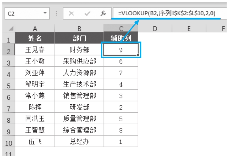 VLOOKUP(B2,序列!$K$2:$L$10,2,0)公式是查找B2单元格(财务部)对应的顺序号。