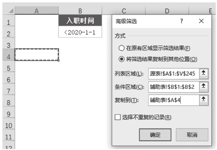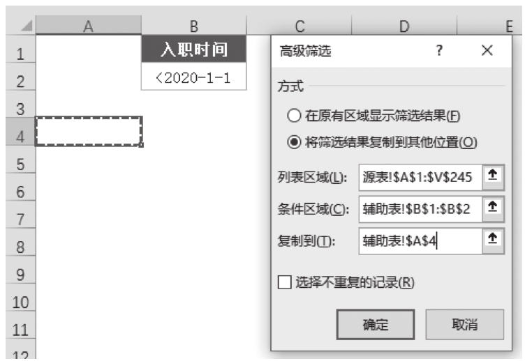 STEP 1: 在“辅助表”工作表中设置筛选条件并进行高级筛选,见图2-27。