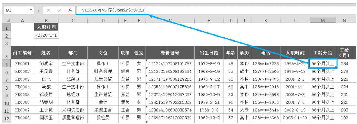 VLOOKUP(N5,序列!$N$2:$O$8,2,1)公式中是使用VLOOKUP的近似匹配,它的第4个参数为1,在使用VLOOKUP近似匹配时,必须保证它的第2个参数中第1列内容是升序排序。这个公式中N5单元格的值为284,与“序列!$N$2:$O$8”数据区域范围的N列数字对比,它是大于等于96,所以返回96对应的“96个月以上”内容。如果N5为2,则属于大于等于1、小于4这个范围,返回结果为“[1-3)个月”。