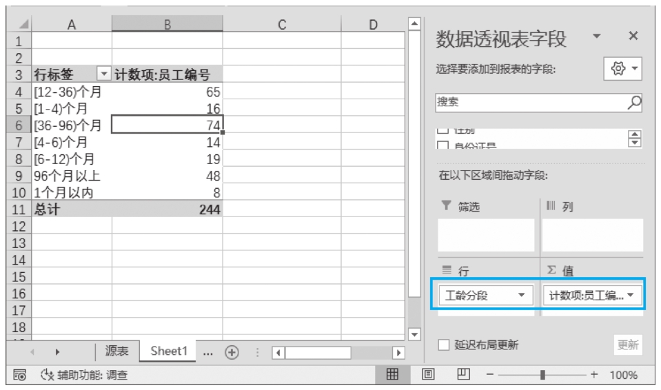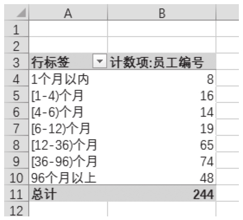 STEP 5: 插入数据透视表,将【工龄分段】字段拖动到【行】区域,将【员工编号】字段拖动到【值】区域,见图2-38。