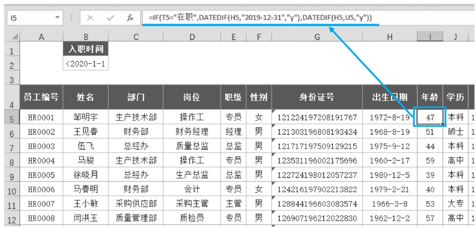 STEP 2: 将2020年1月1日起离职员工的“员工状态”修改为“在职”,并删除对应“离职日期”和“离职原因”内容。在I5单元格输入如下公式,并向下填充公式,见图2-28。
