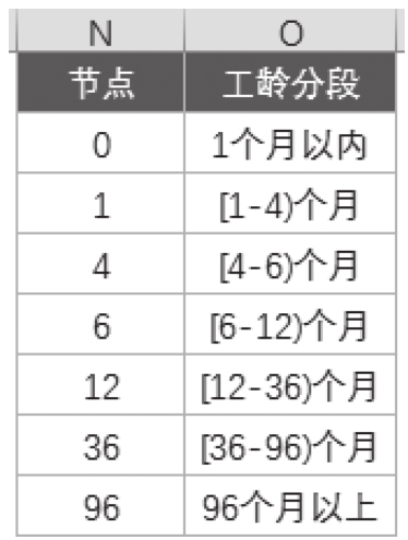 STEP 4: 在“辅助表”工作表中“工龄(月)”列前面插入一列并命名为“工龄分段”,然后在M5单元格中输入公式并向下填充,见图2-37。
