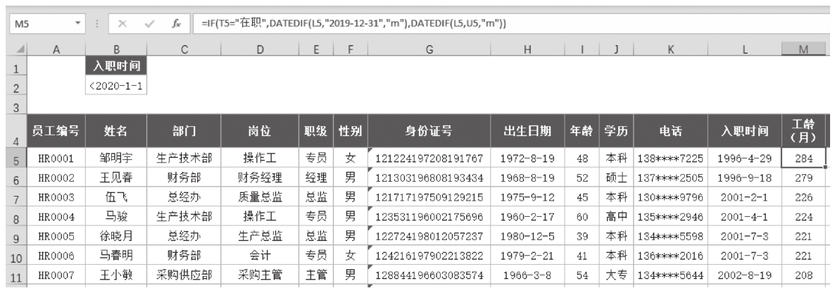 =IF(T5="在职",DATEDIF(L5,"2019-12-31","m"),DATEDIF(L5,U5,"m"))