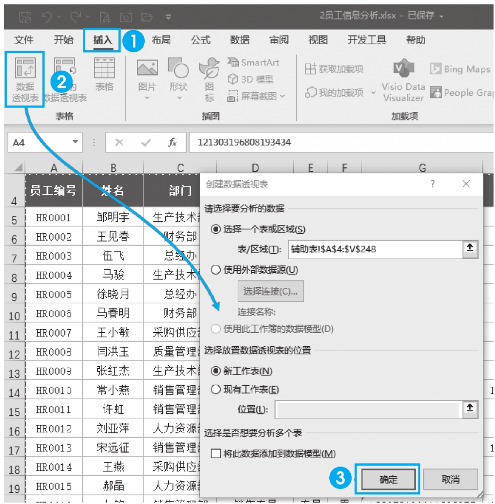 STEP 3: 光标定位在数据表中任意一个单元格,在【插入】选项卡【表格】功能区单击【数据透视表】,在弹出的【创建数据透视表】对话框中直接单击【确定】按钮,见图2-29。