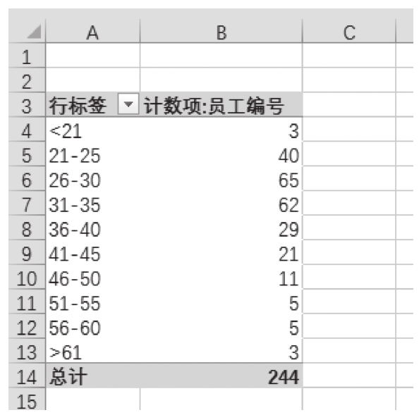 STEP 4: 将【年龄】字段拖动到【行】区域,将【员工编号】字段拖动到【值】区域,效果见图2-31。