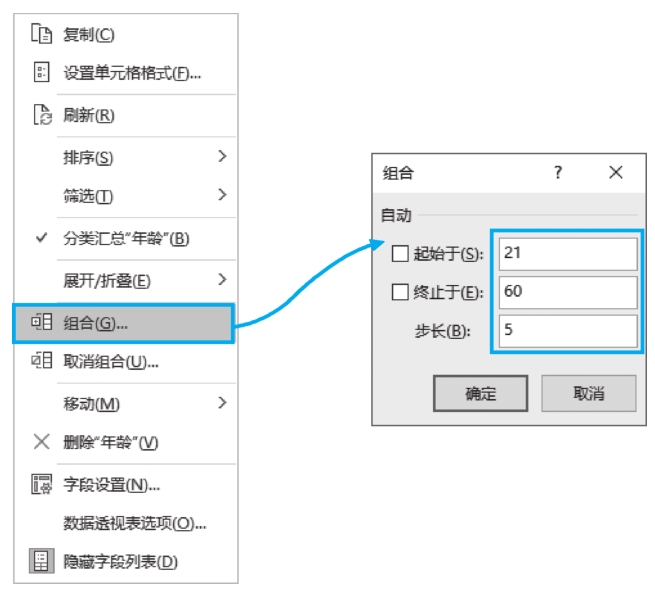 在【组合】对话框中设置时,勾选【起始于】复选框,会默认出现最小数字,本例中是最小年龄。如果在后面文本框中输入数字不同于默认的数字N,则复选框被取消,表示小于N的数字会分为一组,本例中输入“21”后,小于21岁的会被分为一组,在数据透视表中显示“<21”。【终止于】操作是同样道理,【步长】代表以等距分布的大小,本例中是以每5年做一个等距分布。
