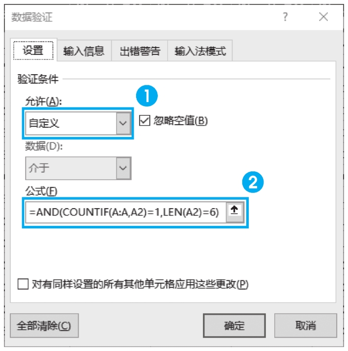① 使用数据验证中的【自定义】功能,要保证输入【公式】文本框中的公式结果为TRUE或FALSE,当结果为TRUE时,在单元格可以正常输入内容,当结果为FALSE时,就会出现错误提示。